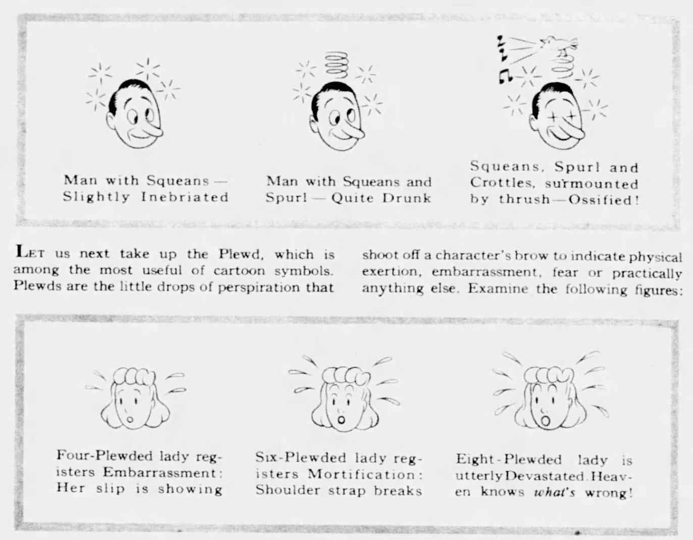 In 1946, columnist Charles Rice in the newspaper supplement tabloid This Week wrote a humorous column titled “Squeans, Plewds, and Briffits, or How to Be A Cartoonist,” in which he presented several visual conventions of comic strips along with the names of such. The column was written in a way that suggested these words already existed and were in use among cartoonists, though Rice had made them all up himself. There was, however, no mention of a grawlix in Rice’s column. At that time and since, one can find others using words and phrases such as “cursing characters” or “obscenicons,” but “grawlix” had not yet been invented.